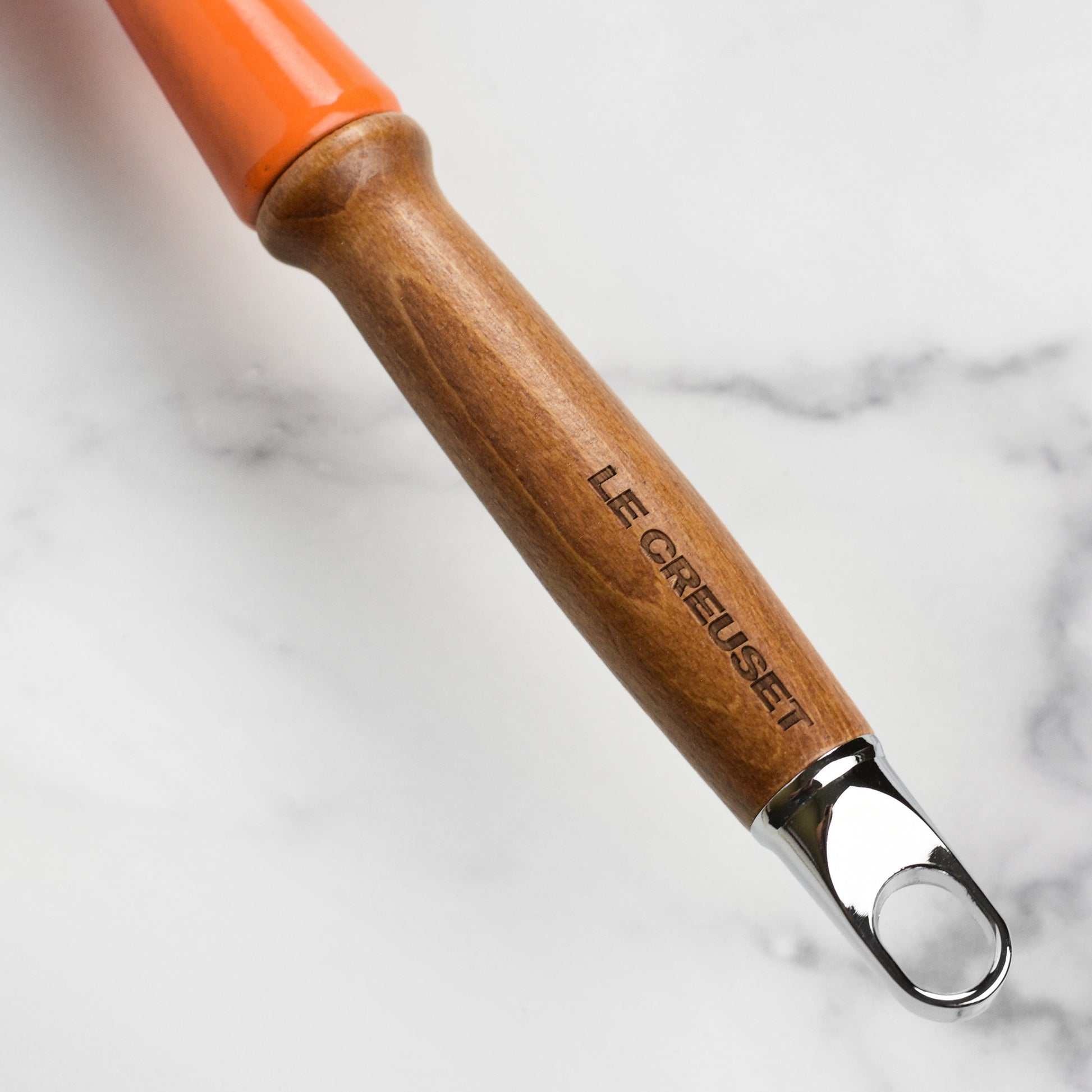 - Ergonomic, durable maple-stained beechwood handle stays cool to the touch; designed for easy lifting from stove to table