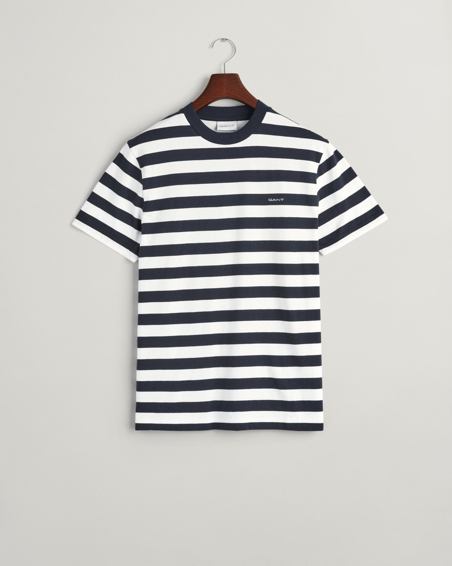 Classic, casual and subtly nautical, this T-shirt is crafted from 100% cotton and features yarn-dyed stripes. Cut for a regular fit with a crew neck, it is complete with ribbed detailing at the neck and a logo embroidered at the chest.