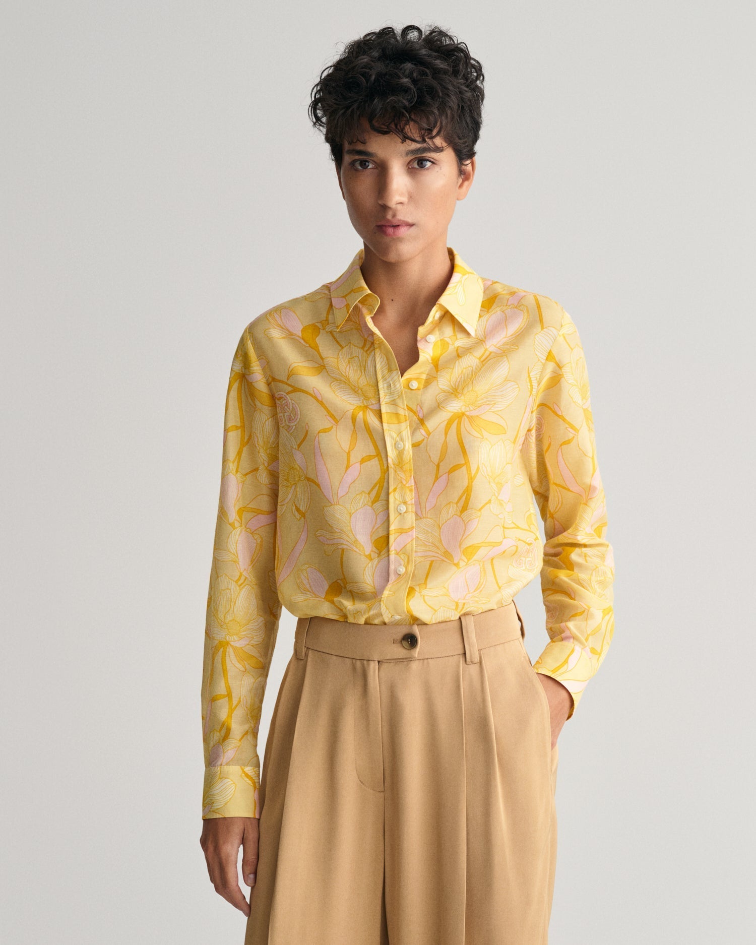 Women's Regular Fit Magnolia Print Cotton Silk Shirt - DUSTY YELLOW