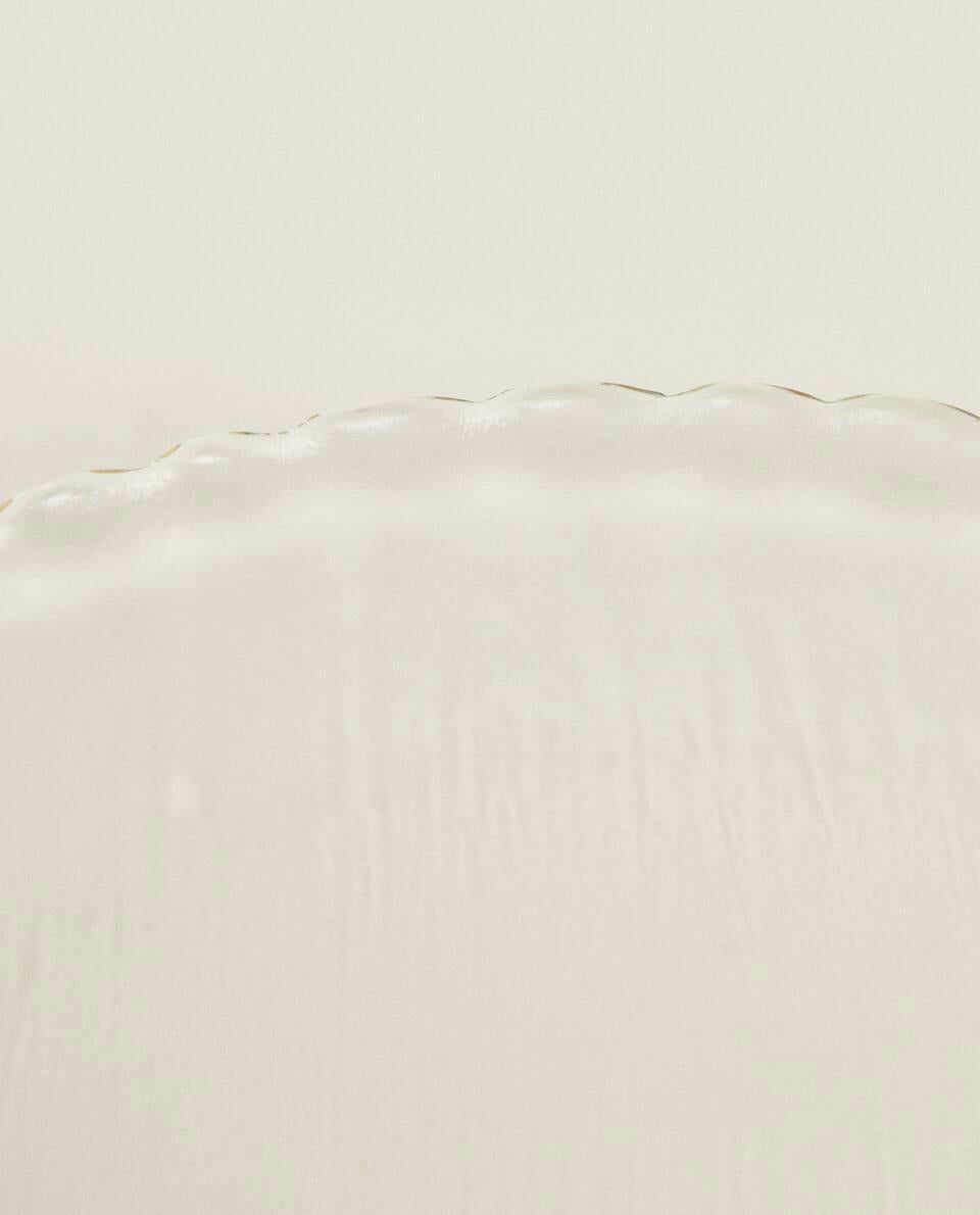 Round glass dessert plate with a scalloped edge and gold rim, for Christmas.