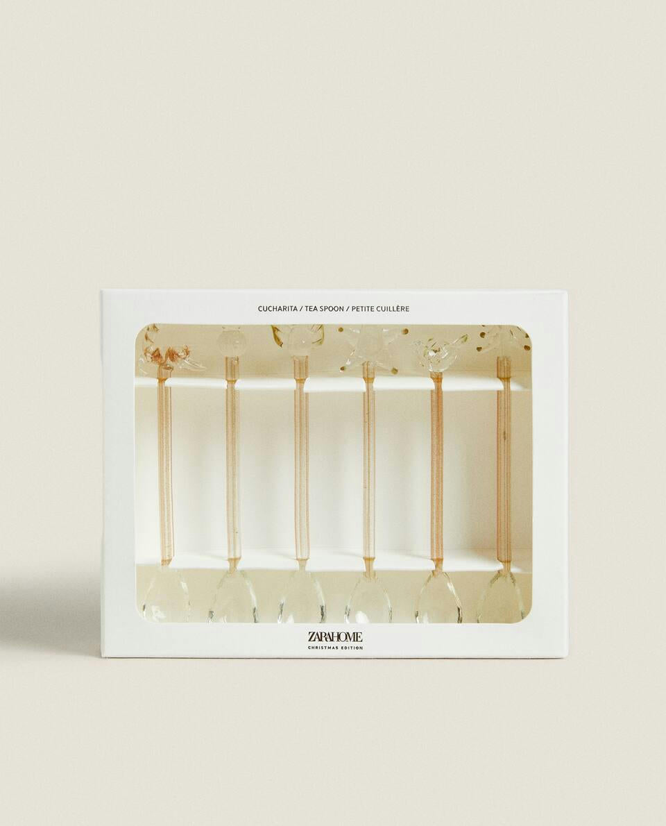 Borosilicate glass teaspoons with a long handle and Christmas figure details with glitter on the handle top.Pack of 6.