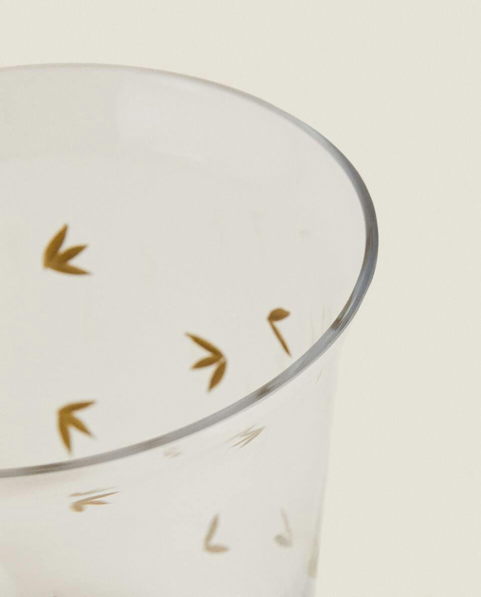 Tall glass tumbler with engraved gold leaves, for Christmas.