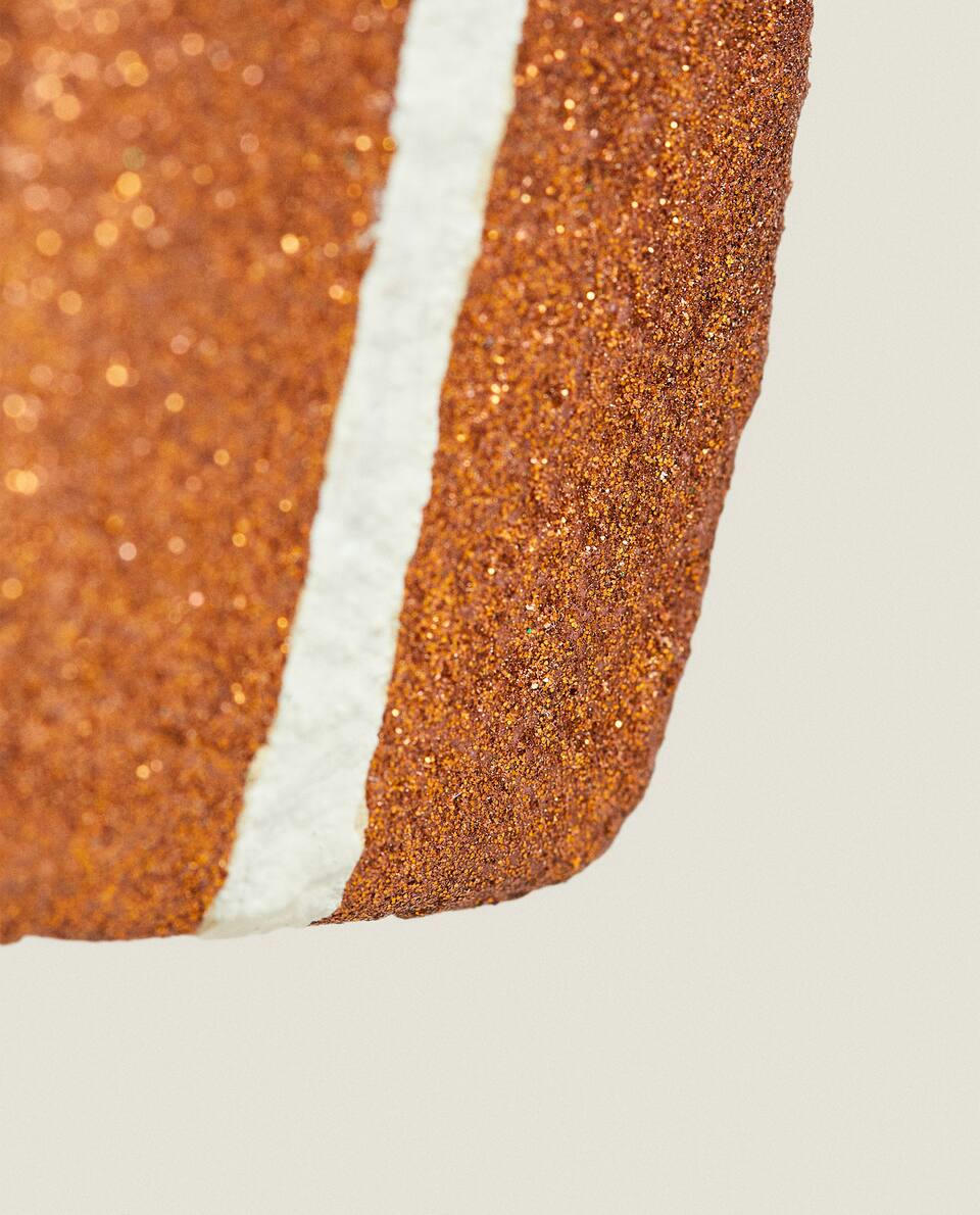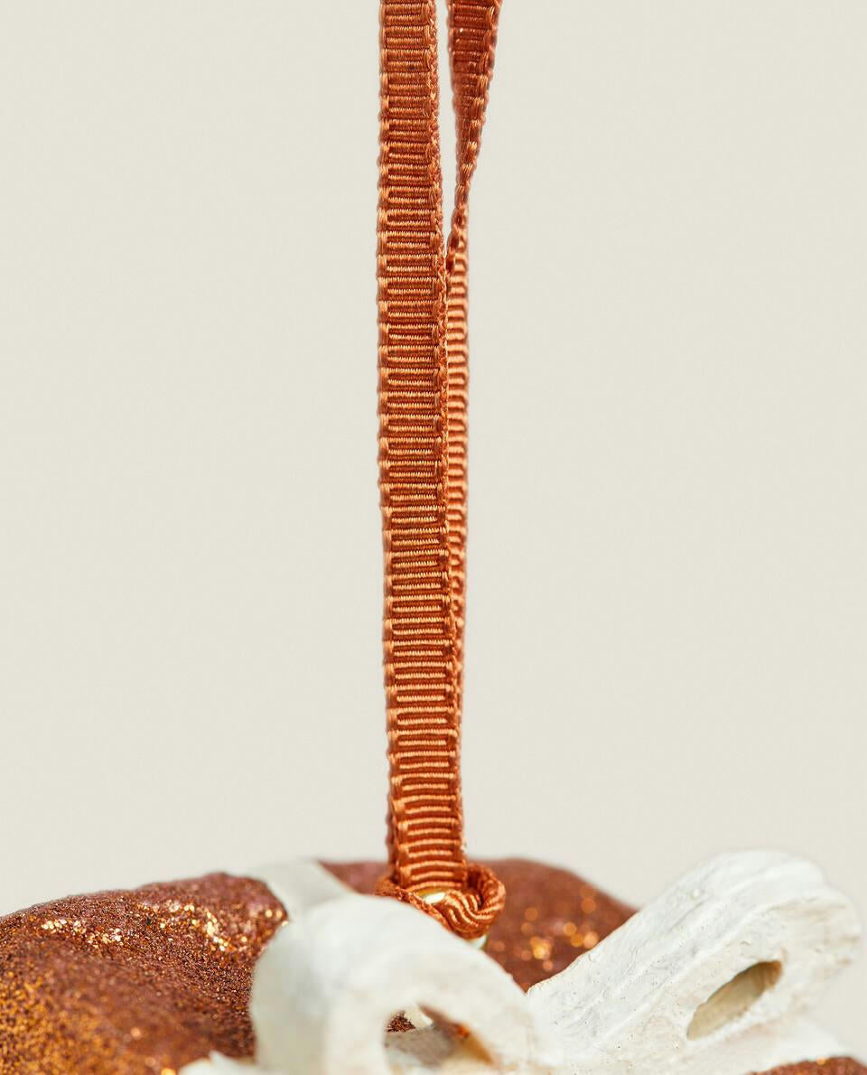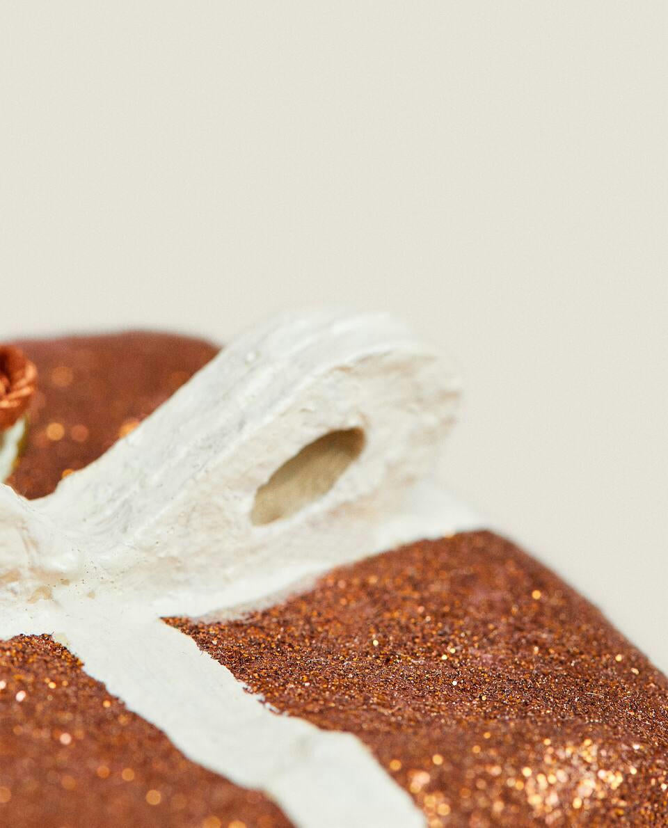 Christmas tree decoration, made of papier-mach in the shape of a gift, with a velvet ribbon for hanging.