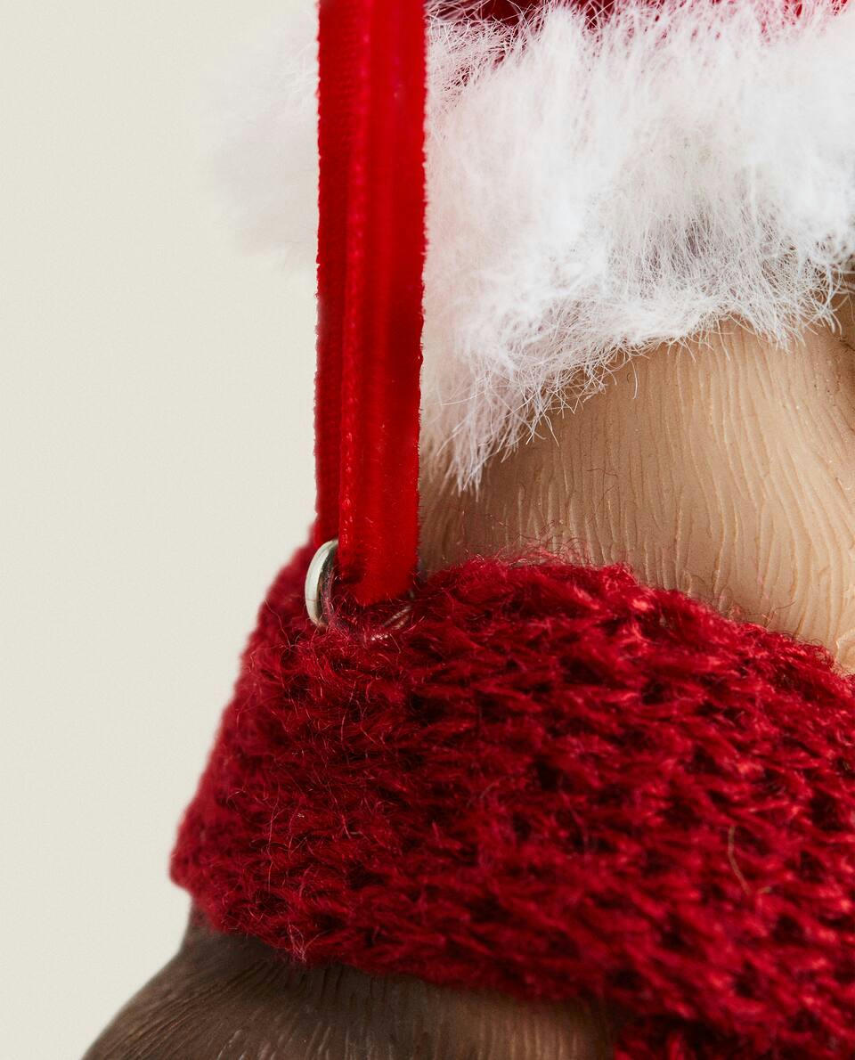 Christmas tree resin decoration in the shape of a bull dog with a knit scarf and Father Christmas hat.