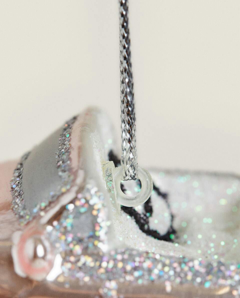 Christmas tree decoration, in the shape of a car, with glitter.