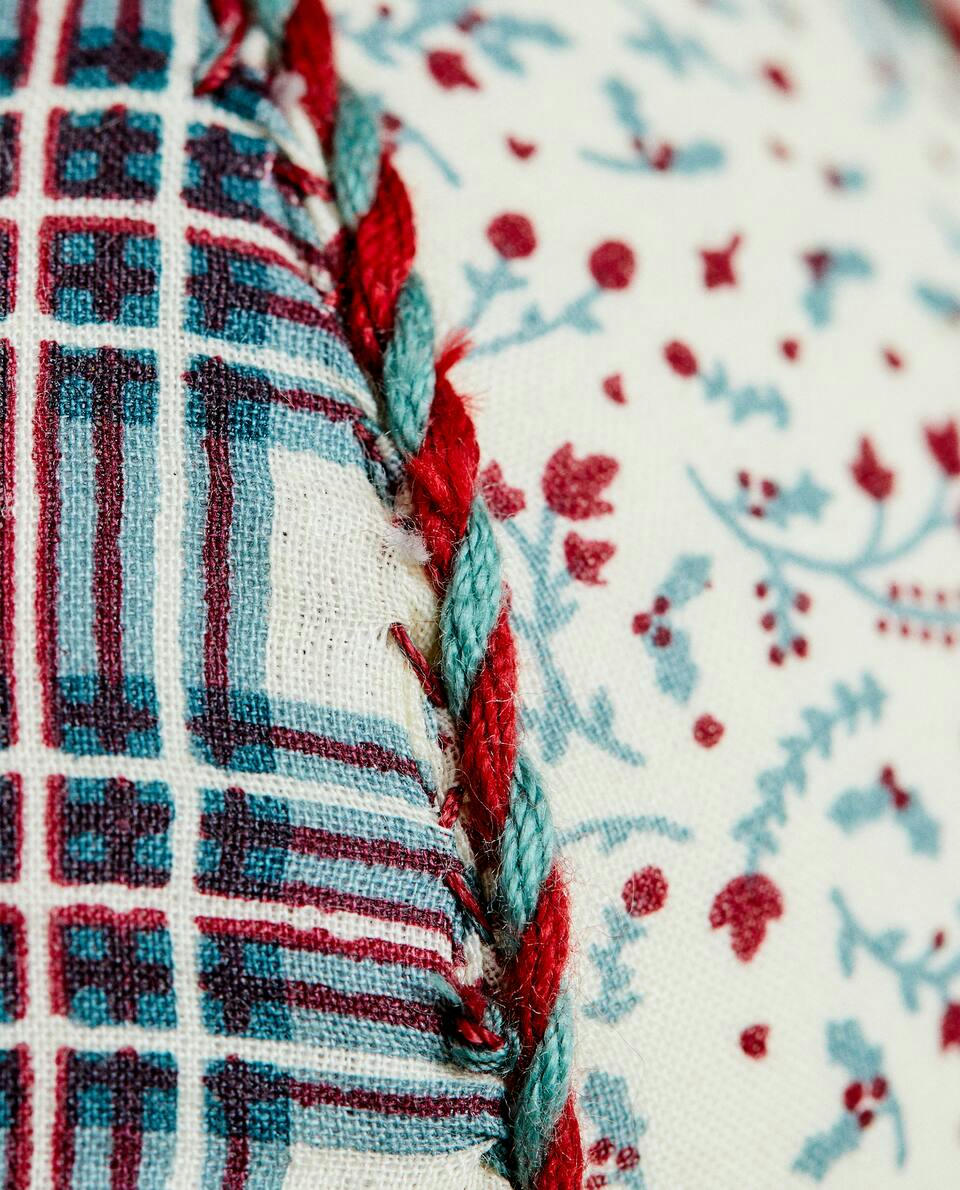 Christmas tree decoration, made of cotton, in the shape of a ball, with a check and floral print, patchwork-style design and braided cord fastening.