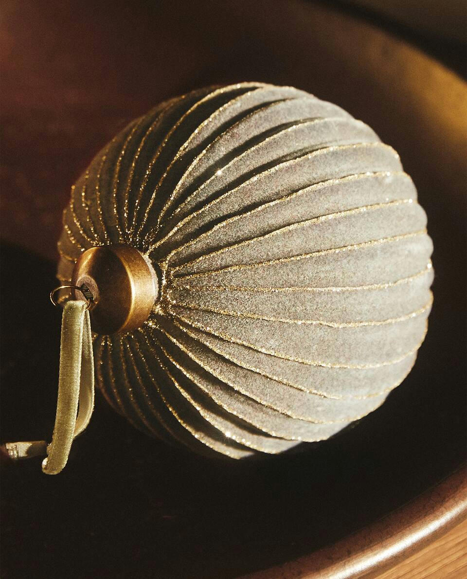 Velvet Christmas tree decoration in the shape of a bauble with a vertical striped texture, glitter and a velvet ribbon for hanging.