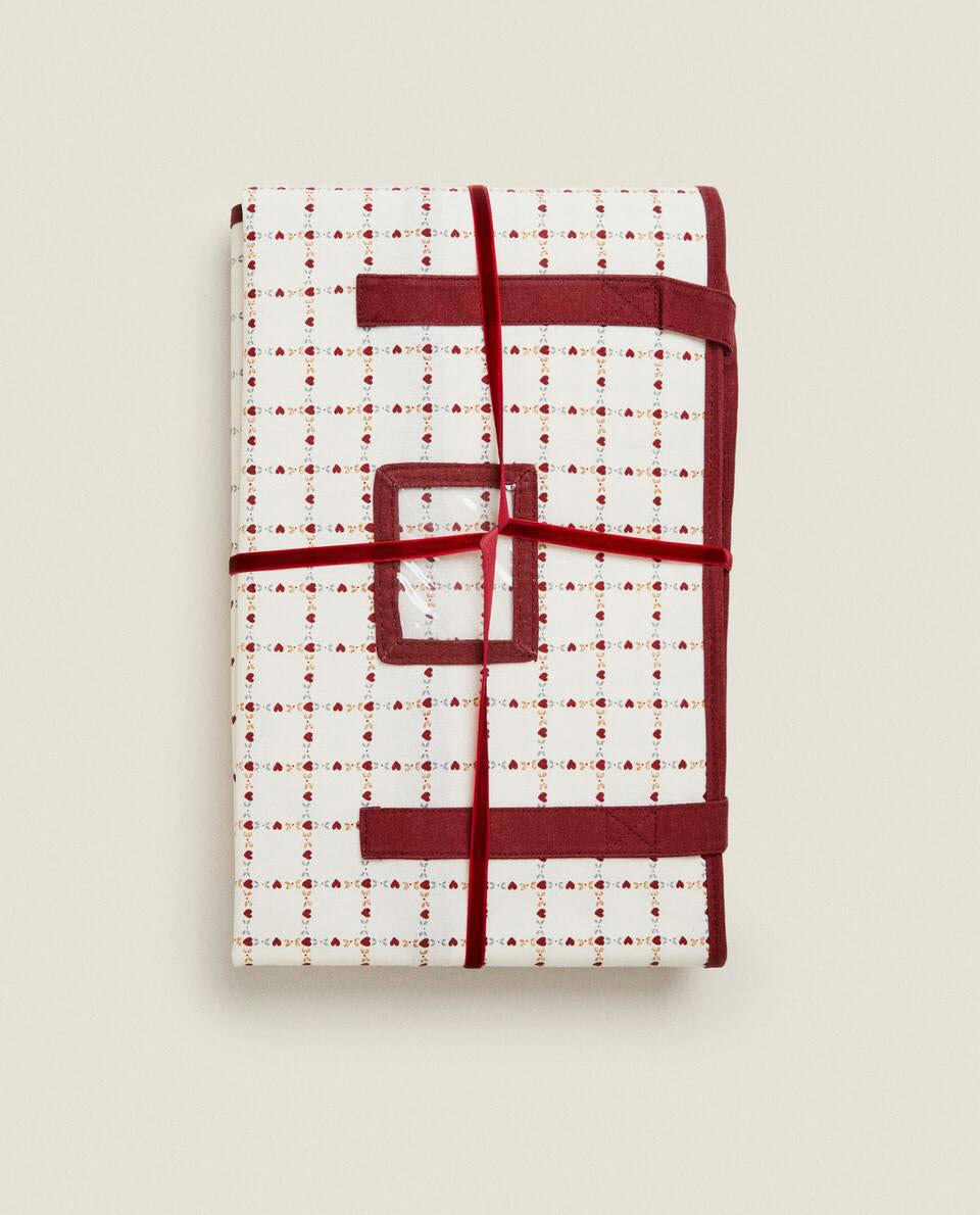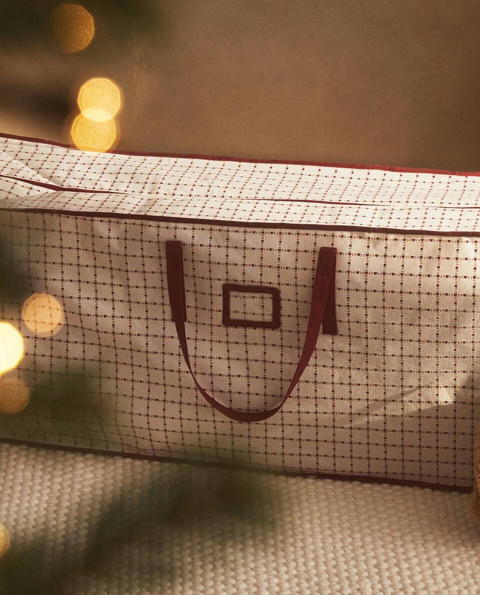 Storage bag with handles on the sides, zip closure at the top and heart motifs for storing the Christmas tree.