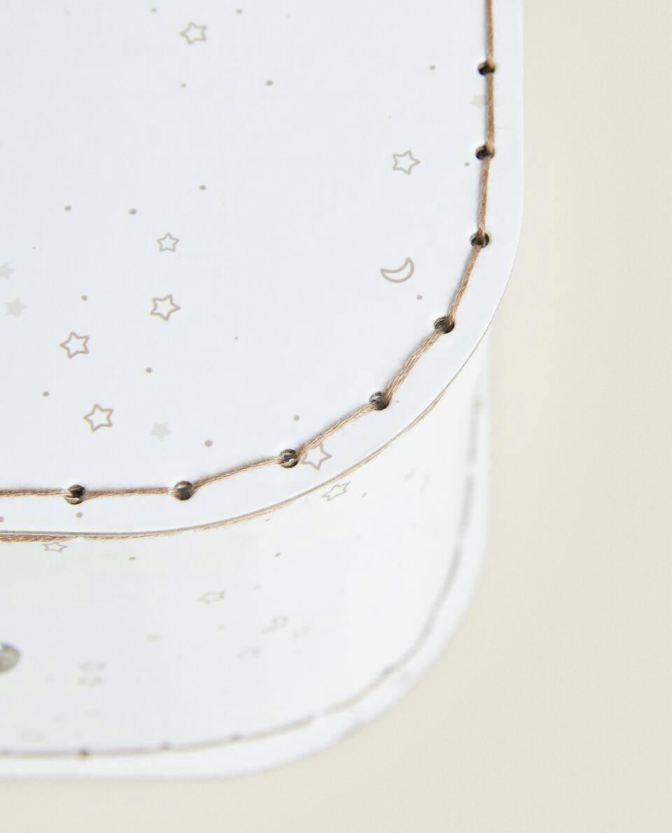 Briefcase with a moon a star print. Metal handle and clasp. Available in two sizes: large pink and small ecru.