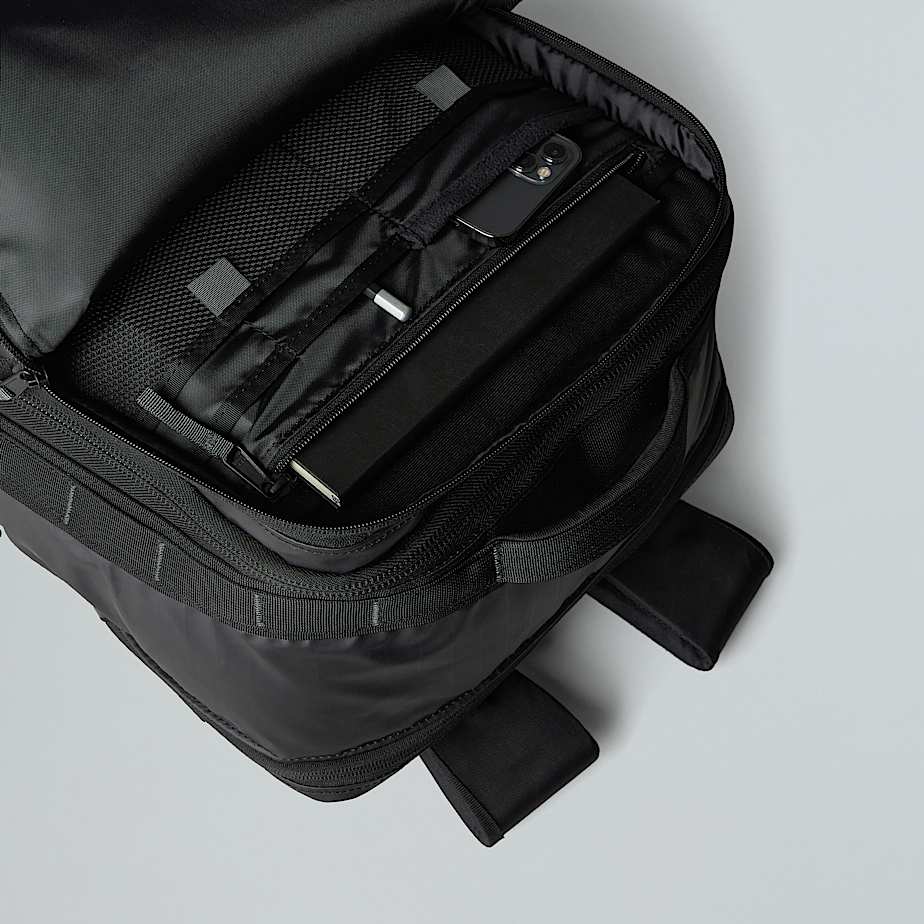 - Inspired by our iconic Base Camp Voyager Duffel, this daypack is just as light and easy to use, with the same focus on travel rather than back-and-beyond expeditions. The shoulder straps and back panel are padded for long-lasting comfort when hanging around at the airport. It's got a padded laptop sleeve, two water bottle pockets, and - to avoid frustrated rummaging - there's an external zipped pocket with organisation for your passport, phone and other travel essentials. There are three padded handles that make hauling the pack a breeze and a luggage pass-through that lets you attach the pack to rolling luggage. Plus, being made from recycled materials, it's a kind choice for nature. Fill it with everything you need for the day's adventures.
